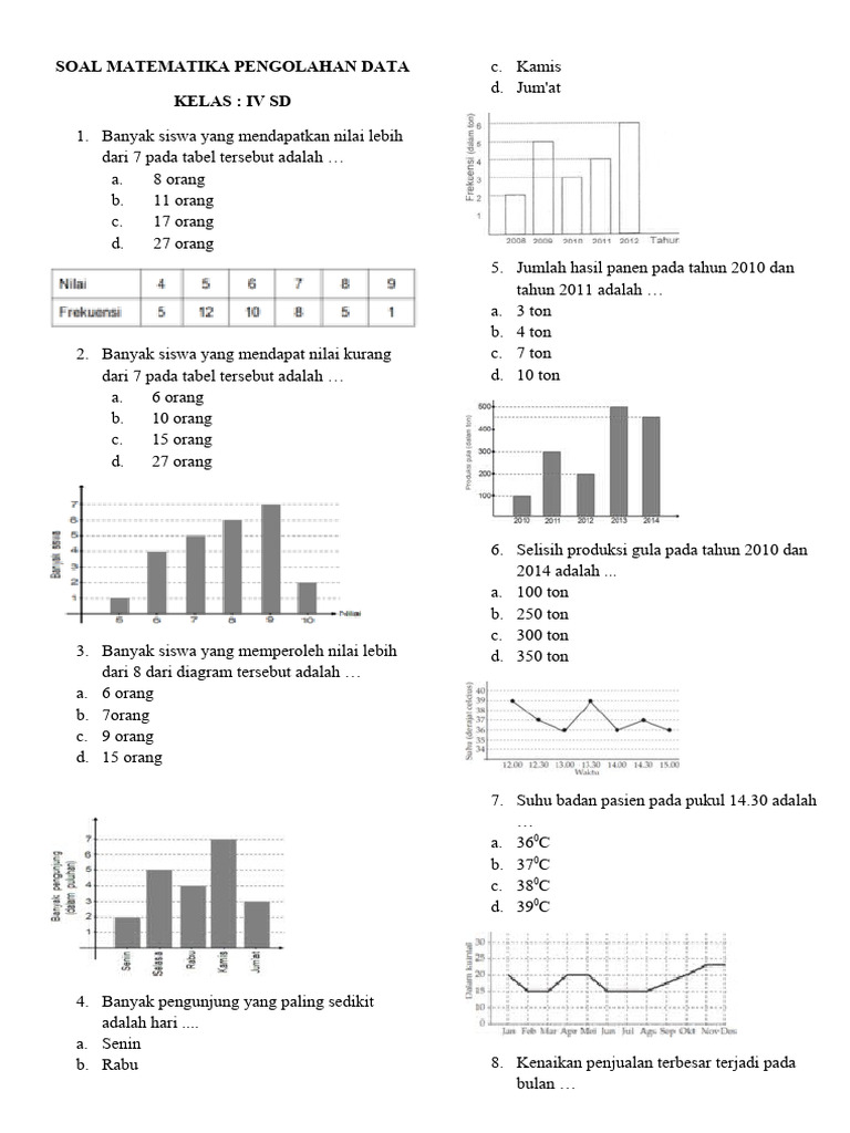 Dalam artikel ini, kita akan menyelami dunia pengolahan data untuk siswa kelas 4. Kita akan membahas konsep-konsep dasarnya, pentingnya mempelajari keterampilan ini, dan yang terpenting, menyajikan kumpulan soal latihan yang bervariasi untuk mengasah pemahaman mereka. Dengan pemahaman yang kuat tentang pengolahan data, anak-anak kelas 4 akan lebih siap menghadapi berbagai situasi, baik di dalam maupun di luar kelas.